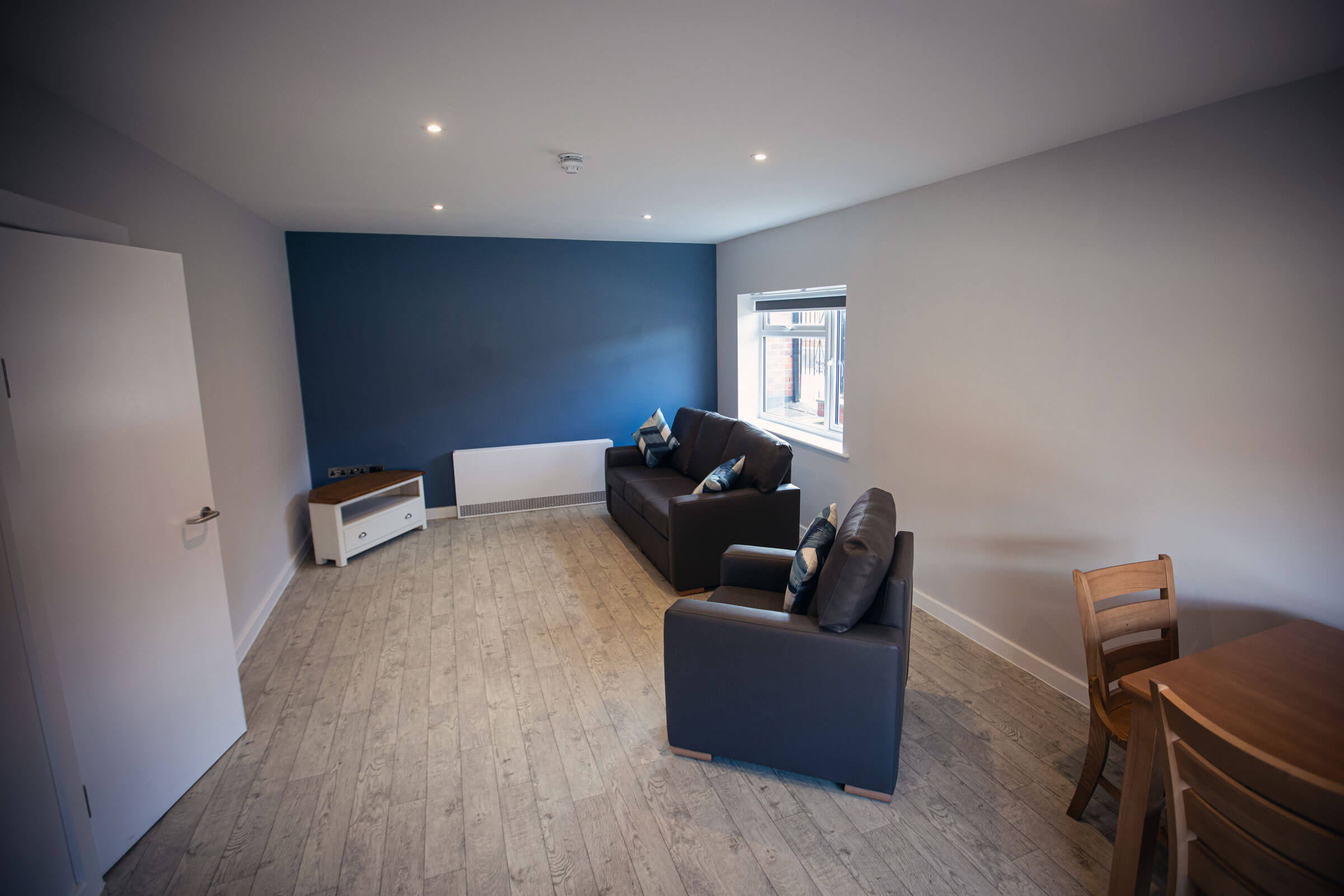 The Meadows is a modern supported living home in Shepshed, offering three self-contained apartments and one duplex designed to promote independence and comfort. Each apartment includes a private bedroom, bathroom, lounge, and kitchenette, giving people supported the freedom of their own space within a safe and supportive environment. A communal lounge provides the option for social interaction, while the layout encourages privacy and personal choice.